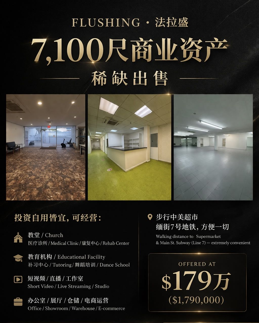 法拉盛 133-24 41st Rd | 1750平方英尺商业店面 | $70/SF/年 | 半地下适合诊所医美会所